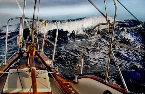 9:55 AM Jul 12th, 2009 Wellen steigen über das Boot oder donnern mit unglaublicher Wucht gegen den Rumpf. Nur minimaler Schaden an der Sprayhood, alles o.k.