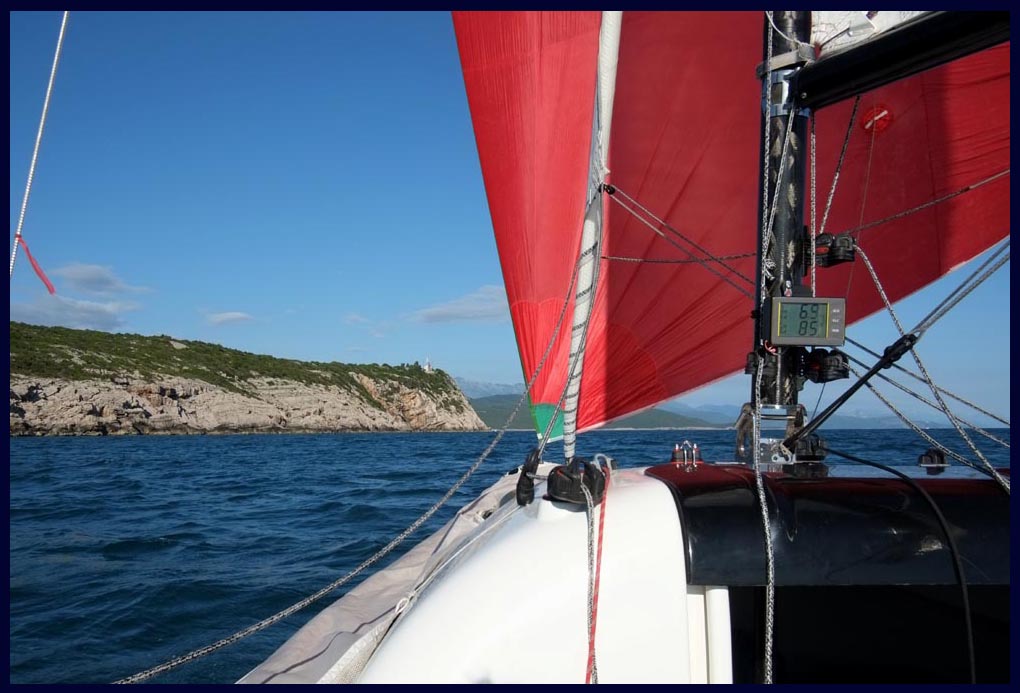 Hier die Spitze des mittleren "Fingers", Mani, Kap Tenaro, der südlichste Punkt der gesamten Balkanhalbinsel - und die südlichste Halse für "October Saray". Danach hieß es Gennaker bergen und ordentlich reffen, denn die tückischen Böen unter Land blieben nicht aus.