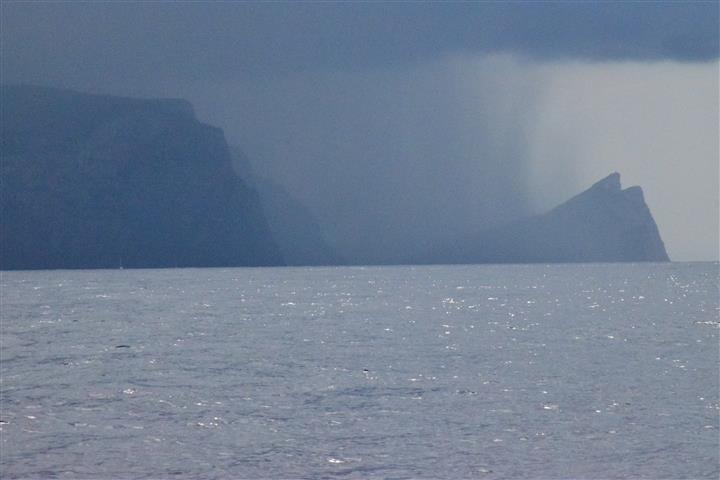Nach dem Aufbruch und dem Runden von Kap Formentor geht es an der Nordküste Mallorcas entlang und in den ein oder anderen Schauer hinein. Hier liegt bereits die spitze Felseninsel Dragonera voraus, wo es gerade etwas heftig zugeht.