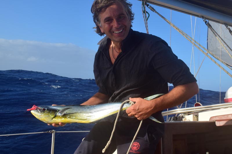 Gut 800sm sind es bis zu den Kapverden, sobald man die weitreichenden Abdeckungen und Düseneffekte der Kanaren hinter sich gelassen hat. Jeden Tag nehme ich zum Training eine Mittagsbreite und bestimme die Länge aus zwei Sonnenschüssen mit gleichem Winkel. All das funktioniert gut und selbst mit meinem billigen Plastiksextanten erziele ich eine sehr gute Genauigkeit von ca. 2sm. Tagsüber ist es oft schwachwindig. In der Nacht kommt etwas Regen und Wind aus tiefen Wolken. Dann brist es mehr auf. Am frühen Morgen binde ich ein Reff ins Groß. Schönes Ozeansegeln, das Meer spaziert gleichgültig dahin, lauter kleine Schaumkronen reiten auf dem Ozean-Teppich. Die ersten fliegenden Fische tauchen auf und bald hängt ein kleiner Bonito an der nachgeschleppten Angelleine. Etwas Salz, Knoblauch, Zitrone - mehr ist nicht nötig. Fantastisch!