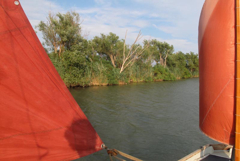 Eine Einfahrt in das Mündungsgebiet des Po Flussauwärts unter Segel im Po di Gnocca