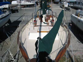 Ich mache Fotos, schlage dann die Segel ab, muss dazu in den Mast, denn der Yankee will nicht runterkommen. Hoch geht es mit Klettergurt und Prusiklift am Spifall. Ich packe die Segel in ihre Segelsäcke. Die Sonne ist wunderbar, es ist heiß, 25°C. Kaum zu glauben, was habe ich gefroren. Mit Jeff, dem Inhaber von Shroeder's Yacht Systems, bespreche ich, was die gute Gavdos so bräuchte. Der Windgenerator funktioniert nicht, der Außenborder läuft nicht richtig, die Batterien sind im Eimer. Ein ganz neues Gefühl, Arbeiten machen zu lassen.