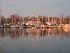 Am Abend koche ich ein spärliches Essen an Bord, der Ort ist ein paar Meilen entfernt, hier wo ich bin, liegen nur hunderte von Booten. Einige Häuser, jedes mit einem Bootsschuppen größer als das Haus selbst, säumen die Seite zur Bay hin. Schöne Bäume und große, grüne Flächen geben der ganzen Umgebung ein Gefühl von Weite und Ruhe.