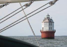Am Morgen hat es 0°C. an Bord. Der Motor startet mit Hilfe eines Kaltstart-Sprays. Ich hole den Anker auf. Der Tag begrüßt mich mit einer "Small Craft Advisory" über Funk. Wind bis 20 Knoten. Zuerst geht es unter Motor aus der Back Creek, bei Thomas Light rolle ich den Yankee aus. Es hat 5 Bft., alles mit Schaumkronen auf dem graugrünen Wasser. Kurze Wellen. Ich segle auf der Chesapeake Bay!